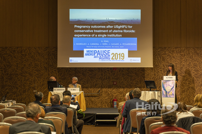 來自西班牙HMT醫(yī)院 HIFU中心的Pons醫(yī)生分享了HIFU治療后,患者自然懷孕的回顧性研究結(jié)果以及長達8年的術(shù)后隨訪結(jié)果,展示了重慶海扶醫(yī)療的海扶刀治療的長期療效(肌瘤生長的有效控制、癥狀的持續(xù)緩解)。在問答環(huán)節(jié),醫(yī)生聽眾對重慶海扶醫(yī)療的設(shè)備及技術(shù)非常感興趣,提問積極踴躍。