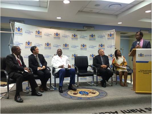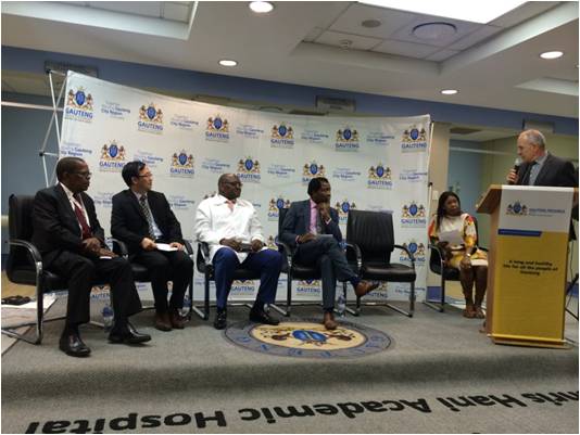 【從左至右:Bara醫(yī)院院長Mfenyana先生、豪登省省長Makhura先生、南非金山大學(xué)副校長Vilakazi教授、Bara醫(yī)院婦產(chǎn)科Setzen教授、豪登省副省長Mahlangu女士】